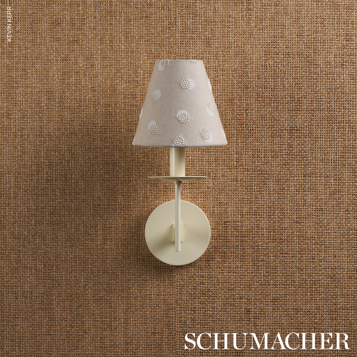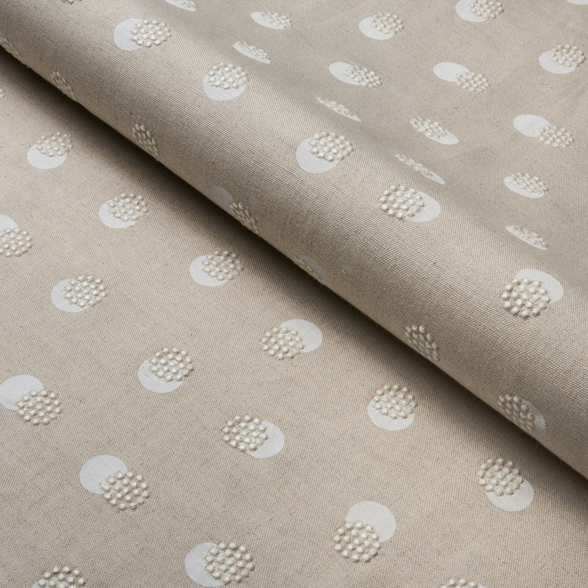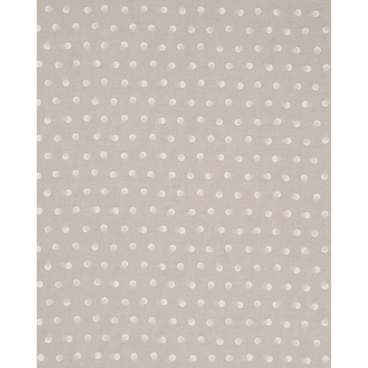 Taylor Embroidery in ivory-on-natural artfully combines a few simple elements—bursts of offset French knots embroidered over a field of hand-screened dots—for a linen fabric that’s visually interesting and super-sophisticated.